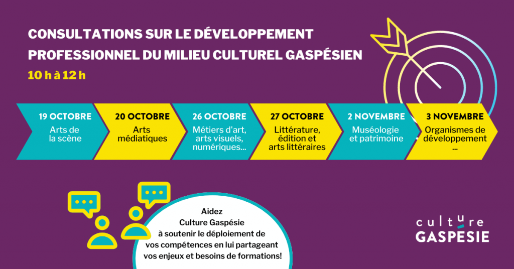 Pour continuer d’apprendre et d’acquérir de nouvelles compétences, la formation continue est un outil de prédilection. Afin de bien répondre aux besoins du milieu culturel, l’équipe de Culture Gaspésie tiendra six rencontres de consultations du 19 octobre au 3 novembre 2022.