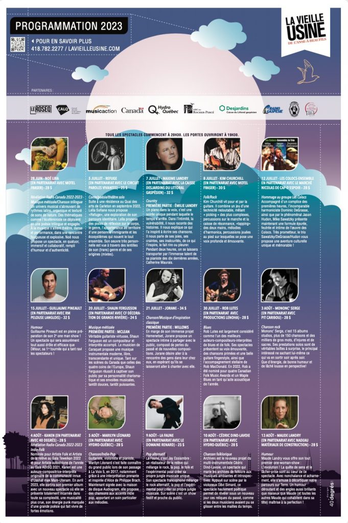La Vieille Usine de l’Anse-à-Beaufils accueillera cet été une vingtaine de spectacles dans le cadre de sa programmation estivale qui réserve de belles découvertes et des artistes établis aux spectateurs. Tour d’horizon de la programmation en compagnie de Zoé Jean-Deslauriers, coordinatrice de l’événementiel et de la communication.
