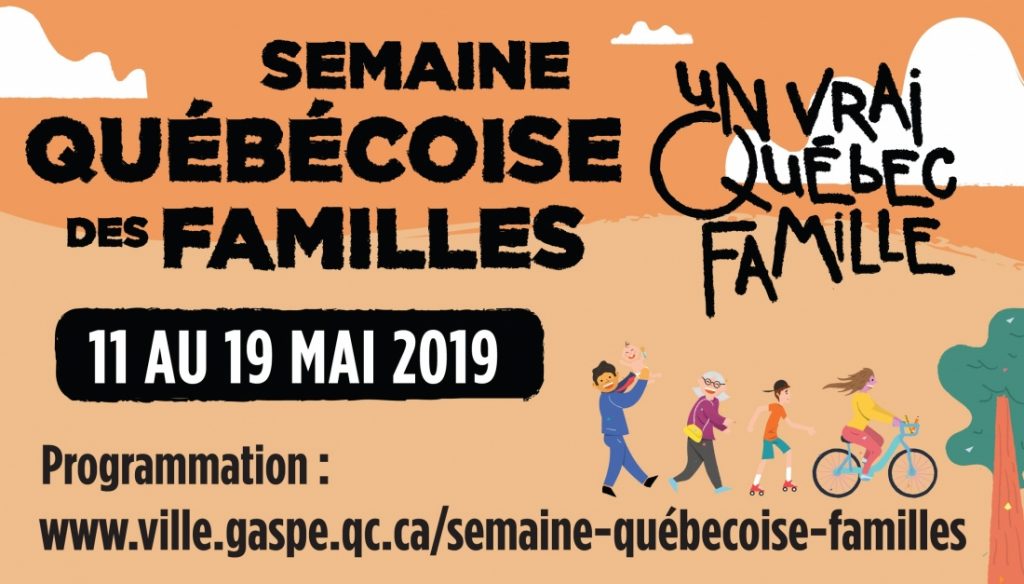 La Ville de Gaspé ainsi que ses partenaires présentent avec enthousiasme la programmation 2019 de l’événement annuel panquébécois de promotion et de valorisation de la famille : la Semaine québécoise des familles! Une gamme d’activités variées, s’adressant à tous les âges et sur tout le territoire de la Ville de Gaspé, sera offerte du 11 au 19 mai!