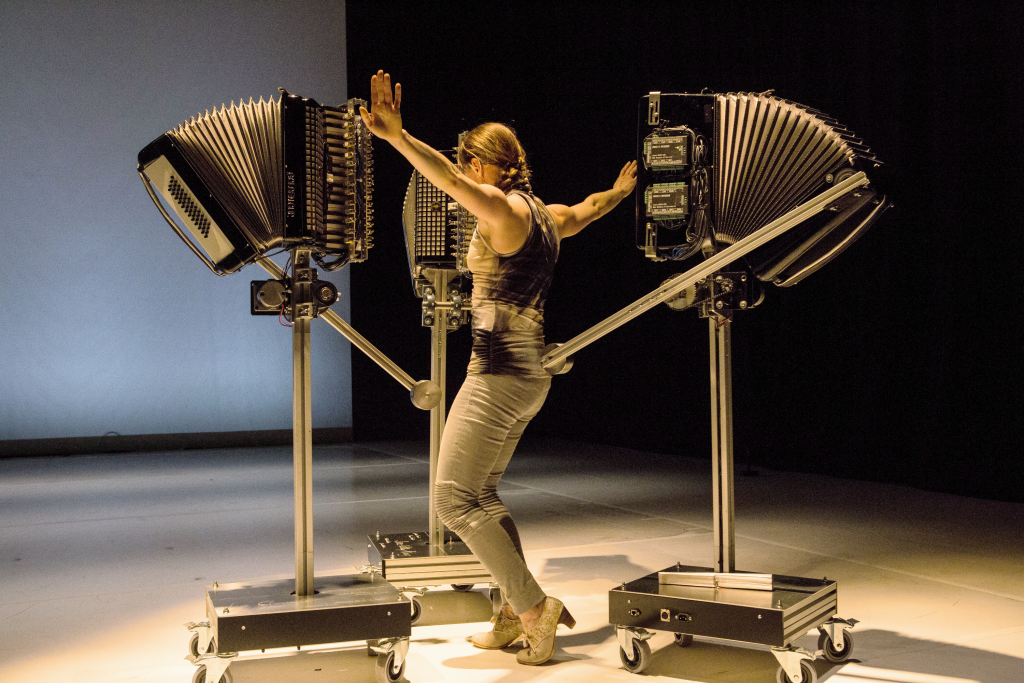 C’est avec un chœur de cinq accordéons-robots et une chorégraphie ancrée dans le flamenco, qu’on explore la dimension communicationnelle du souffle, dans cette version prolongée de la pièce, enrichie d’une nouvelle équipe dont l’interprète et co-créateur Olivier Arseneault.